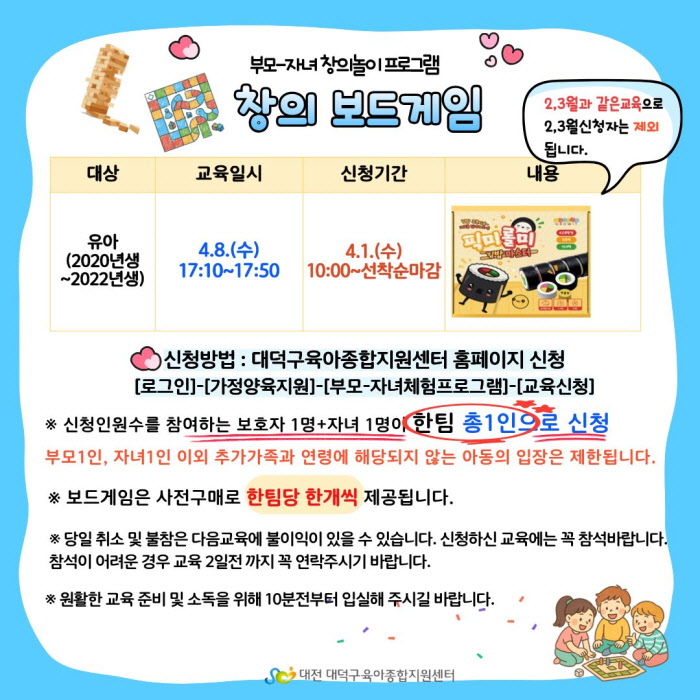 ※ 안내문에 안내된 보드게임 교육은 1~2월과 같은 교육이 아니라, 2~3월과 같은 교육으로 진행됩니다. 이용에 참고하시어 신청 부탁드립니다.