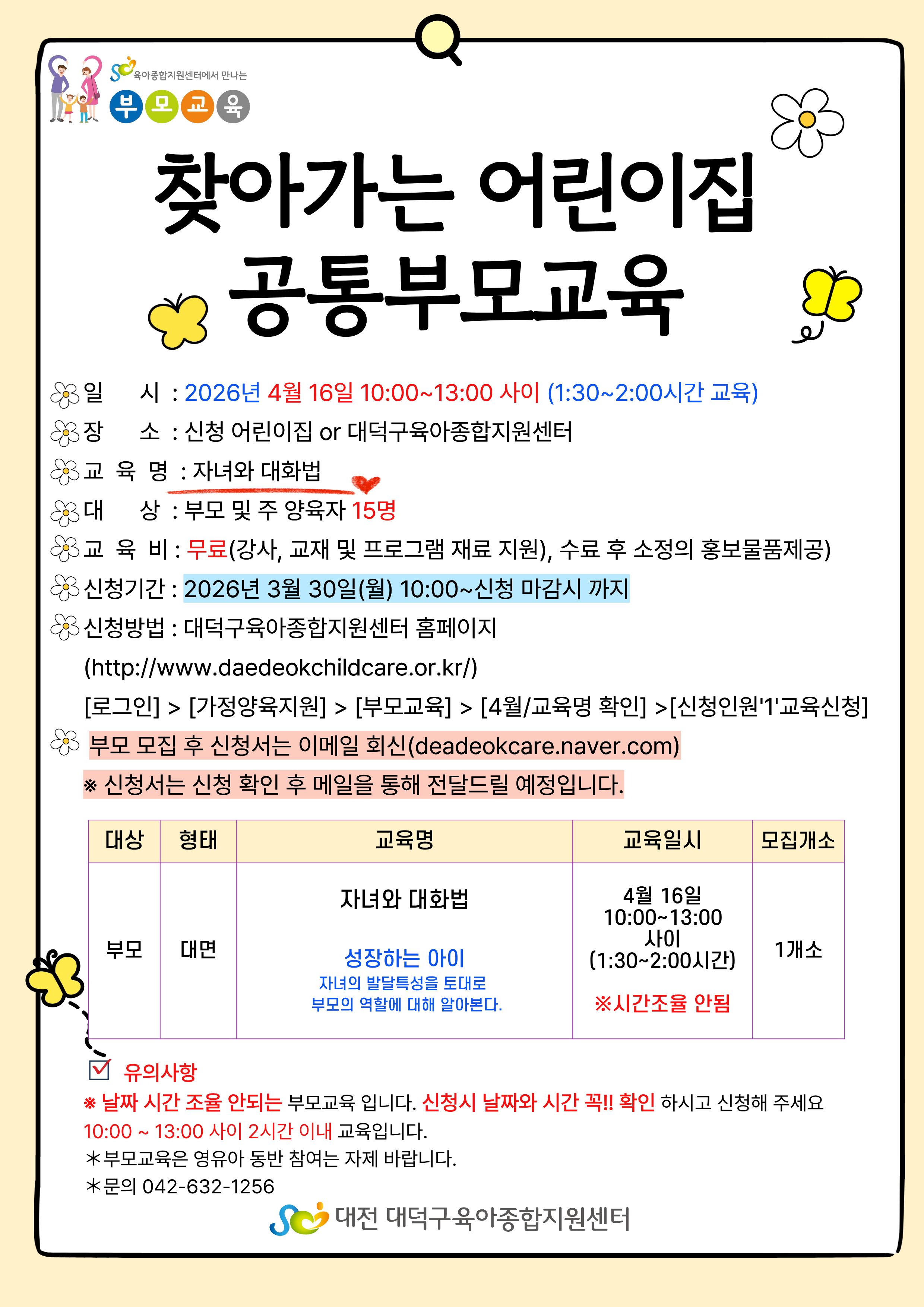 [가정양육지원] 찾아가는 공통부모교육 4월 추가교육 모집 안내