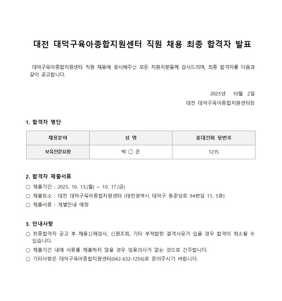 [대덕구육아종합지원센터] 대전 대덕구육아종합지원센터 직원(보육전문요원)채용 최종합격자 발표