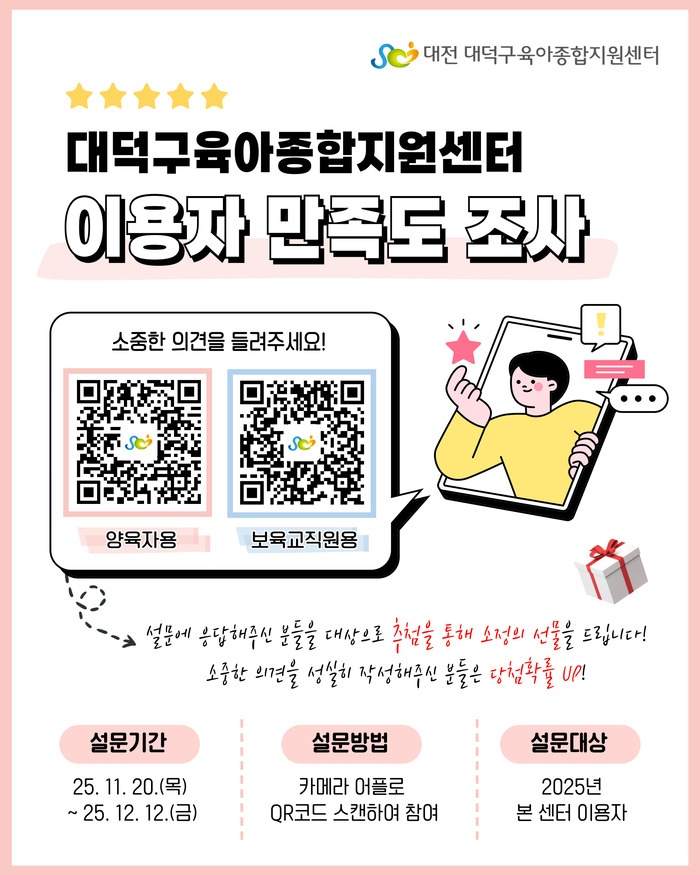 대덕구육아종합지원센터에서는 이용자 여러분의 소중한 의견을 수렴하여 차후 사업 운영에 반영하고자 만족도 조사를 실시합니다.