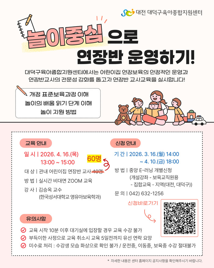 「2026년 연장반 교사교육 - 놀이중심으로 연장반 운영하기」를 진행하고자 합니다.