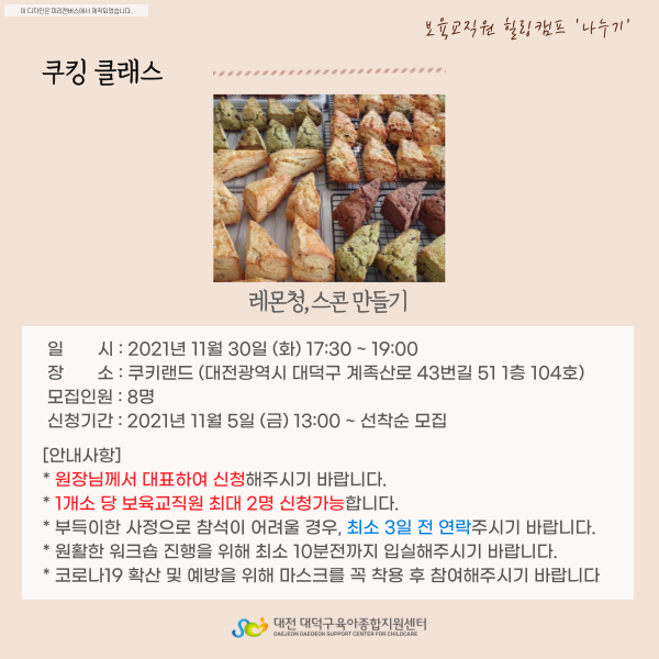 ※ 홈페이지 신청 후 어린이집명, 참여 보육교직원 성함과 전화번호를 대덕구육아종합지원센터로 문자발송 해주시기 바랍니다.