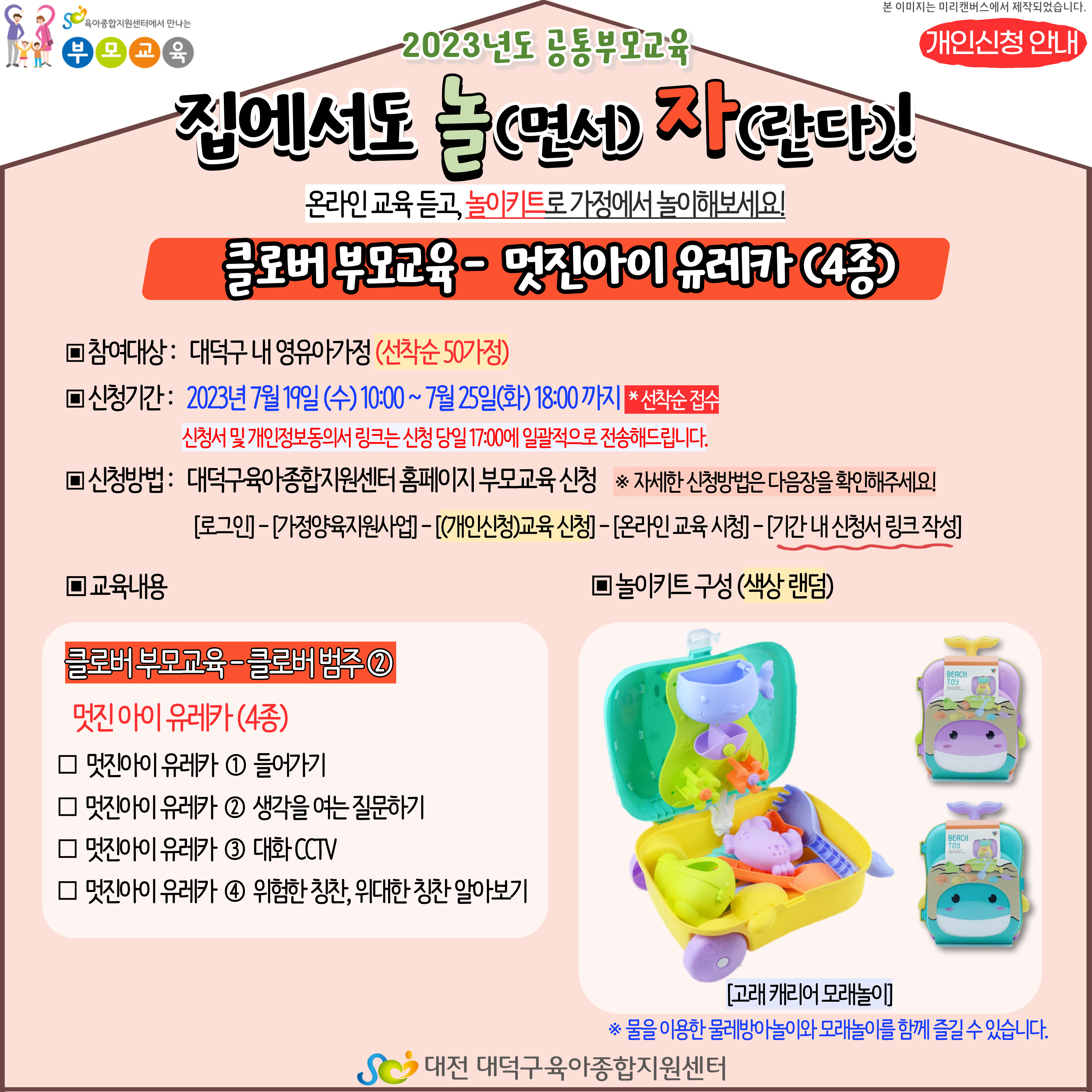 * 1가정 1개 제공을 원칙으로 하며, 1가정에 두 명의 아이가 있는 경우에는 아빠, 엄마 두 분이 영상을 모두 시청하신 후 신청서를 2부 작성하여 보내주시면 2개 제공이 가능합니다. 이 때, 홈페이지 신청페이지 하단 신청인원 : 두 명의 아이 신청 → 신청인원 2입력!