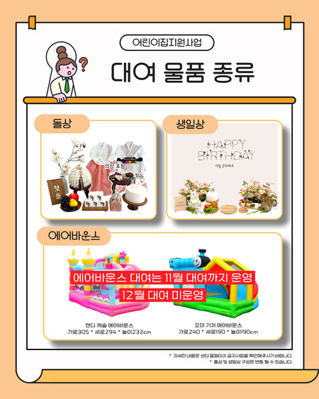 어린이집 운영비 절감 및 다양한 행사 및 프로그램 운영을 지원하기 위한 「어린이집 행사 물품 대여 」를 진행하고자 합니다.
