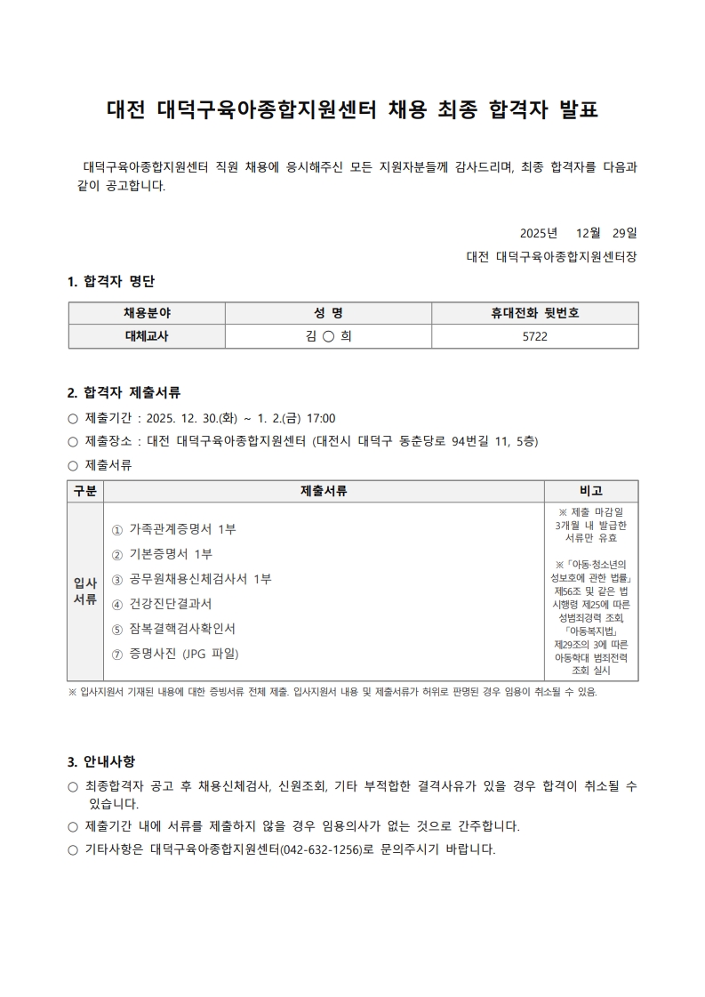 [대덕구육아종합지원센터] 대전 대덕구육아종합지원센터 대체교사 채용 최종합격자 발표