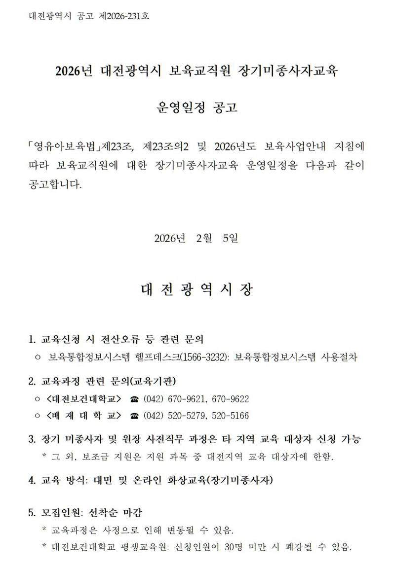 [대전광역시] 2026년 대전광역시 보육교직원 장기미종사자교육 운영일정 안내