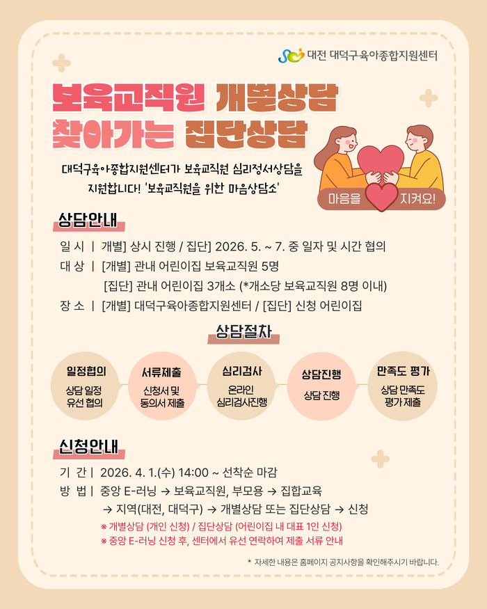 [어린이집지원사업] 2026년 보육교직원 심리정서 상담 안내 (개별 및 집단상담)
